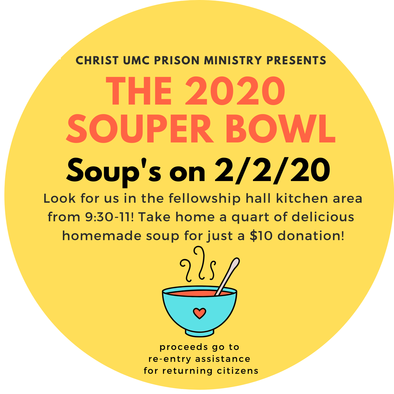 Once again, the Christ UMC Prison Ministry will be offering delicious soups for sale for Super Bowl Sunday (Sun, Feb 2). Be sure to get yours! Pre-orders are strongly encouraged, or come by the kitchen on Sun, Feb 2.